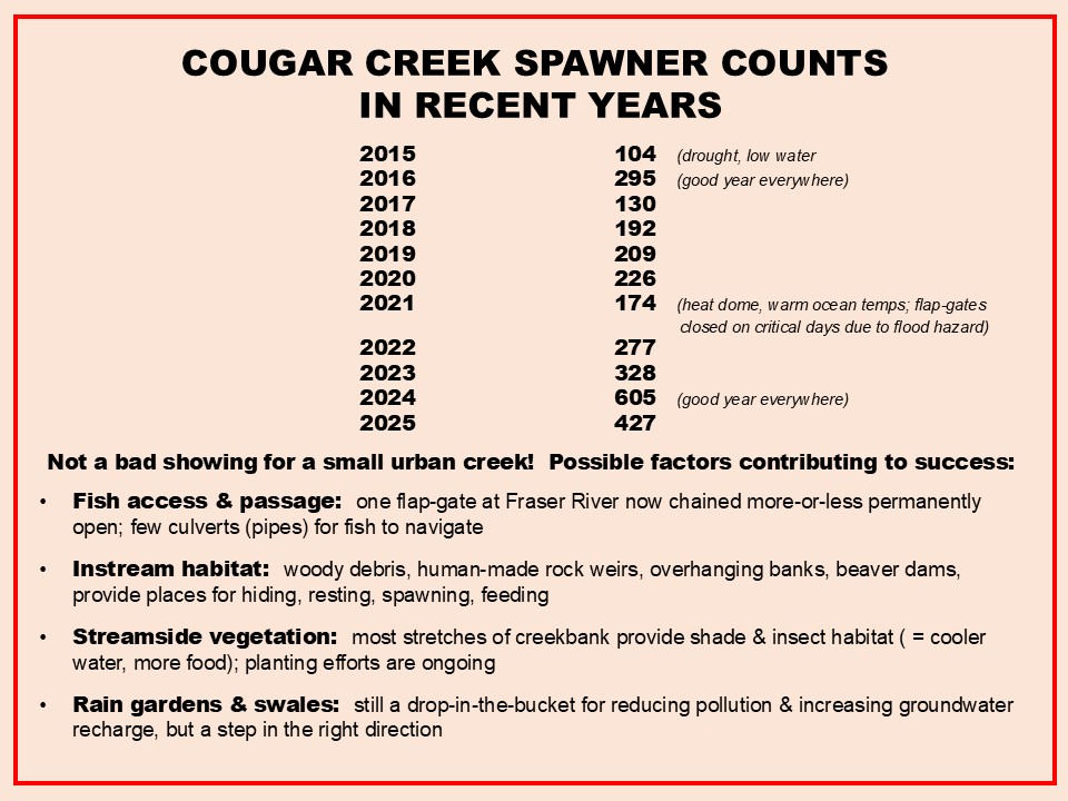 From about mid-October to mid-December, when coho and chum salmon spawners return to Cougar Creek to lay their eggs in shallow redds (nests) and then die, our Stream Monitors do weekly counts to help us assess the health of fish populations. Returns of wild coho always outnumber returns of hatchery chum (despite large releases of chum fry) — yay, wild salmon! If you’d like to be involved in spotting or photographing spawners, please contact us.